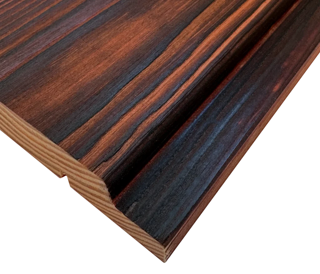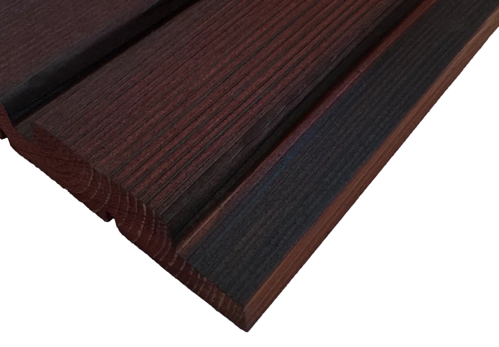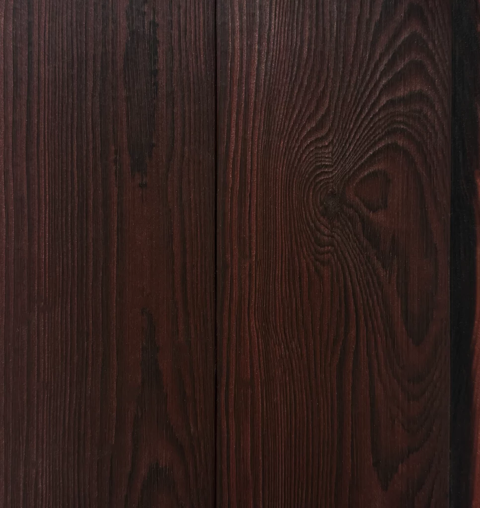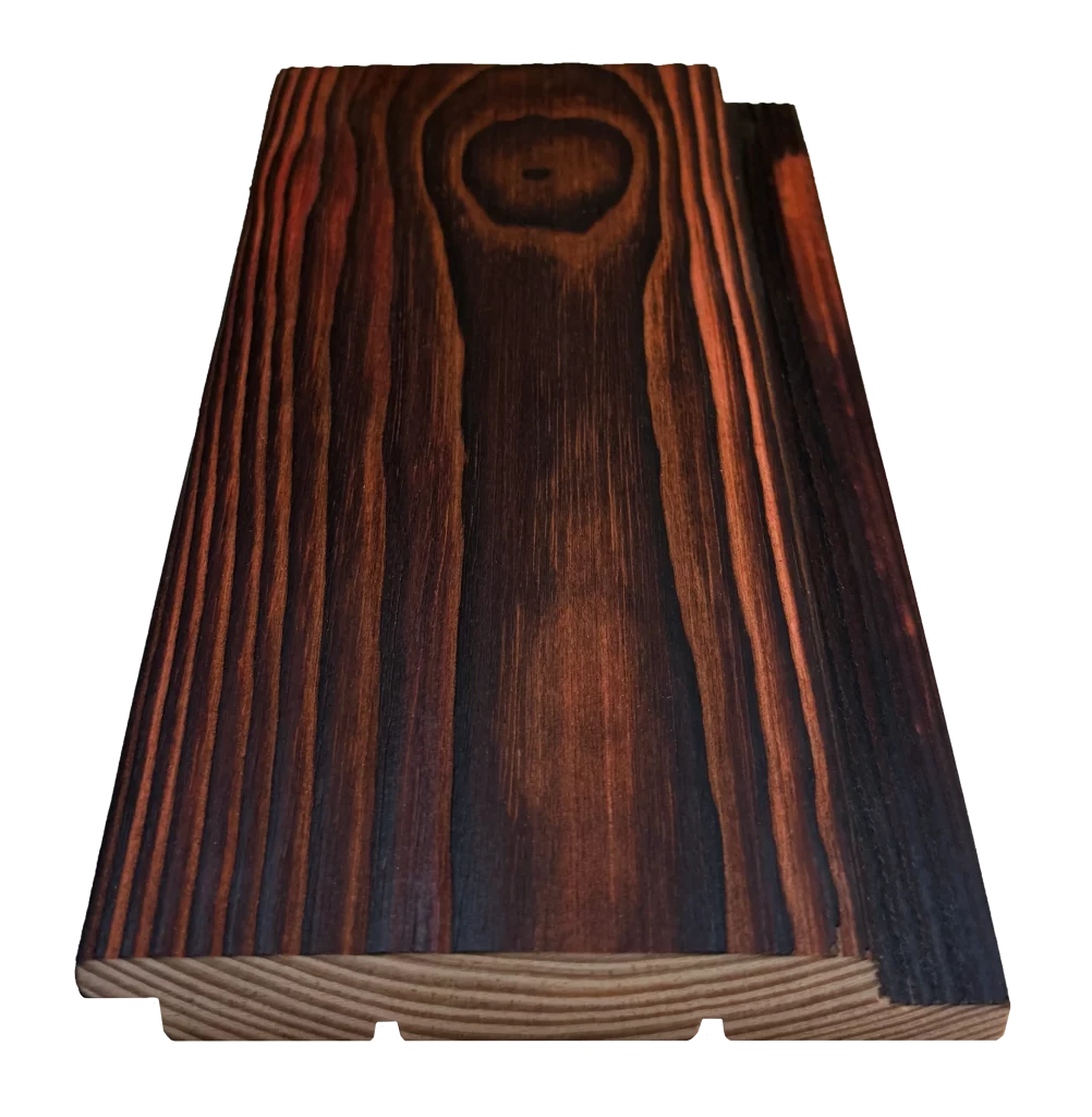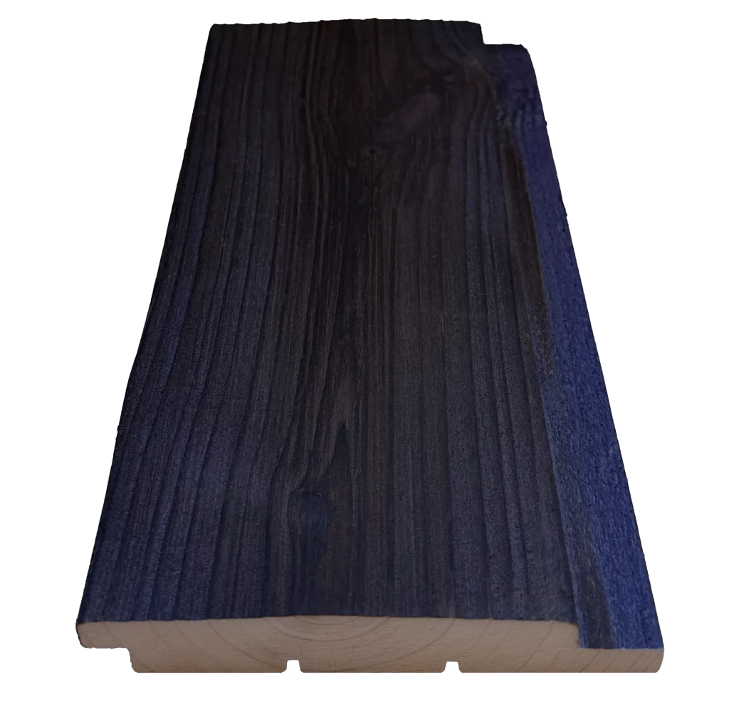 Our industrially charred spruce and pine boards are treated with controlled flaming, reaching a burn depth of up to 3 mm. During post-processing, the brushing stage removes excess carbonized particles while preserving a distinct wood grain and a uniform charred tonality.
