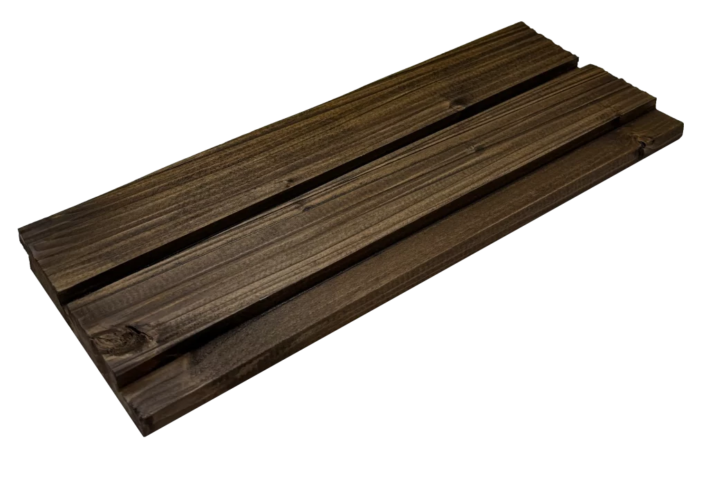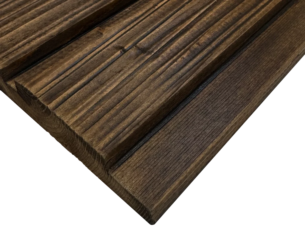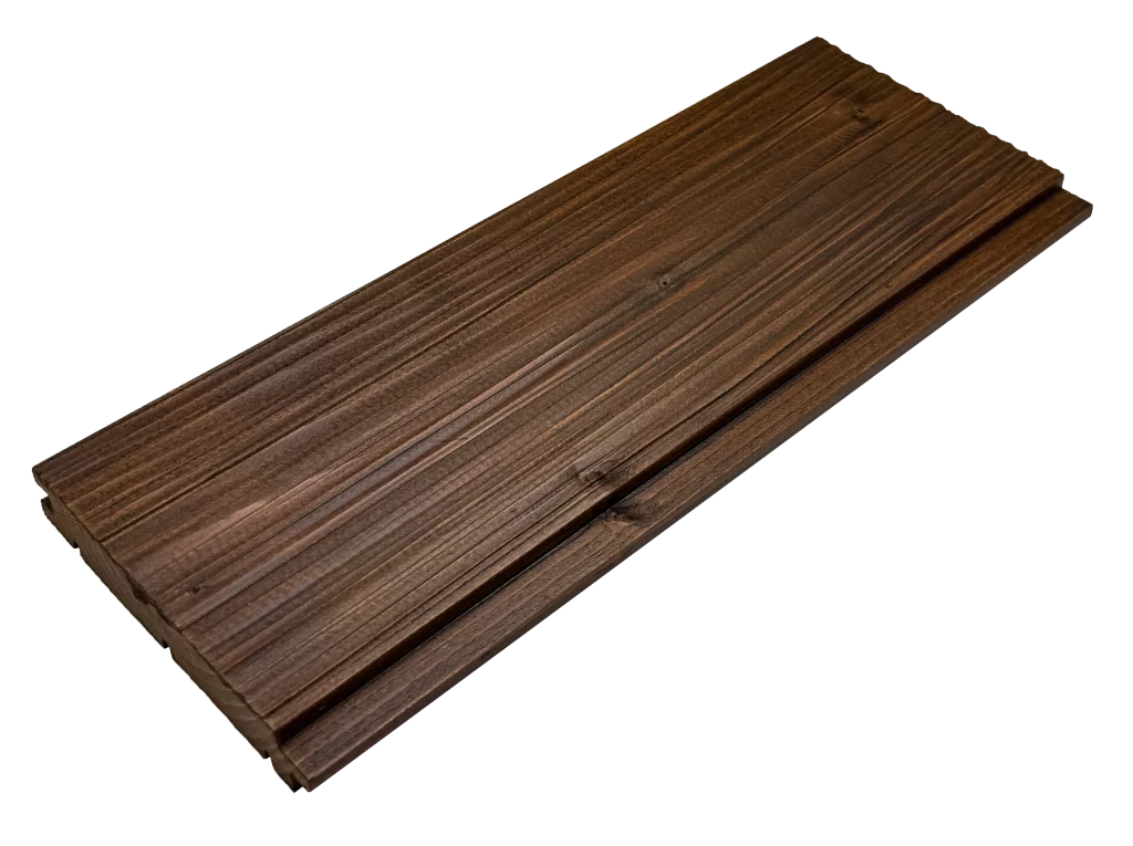 Our Thermo-wood cladding consists of thermally modified spruce and pine boards. During the modification process, the wood is structurally transformed under high temperatures (160–220°C) in a controlled, low-oxygen environment. This thermal treatment reduces the wood’s hygroscopicity, stabilizes its geometry, and significantly enhances its resistance to biological factors and temperature fluctuations. As a result, the material acquires a uniform, warm, and deep tonality throughout its cross-section, ensuring predictable performance during its lifespan.