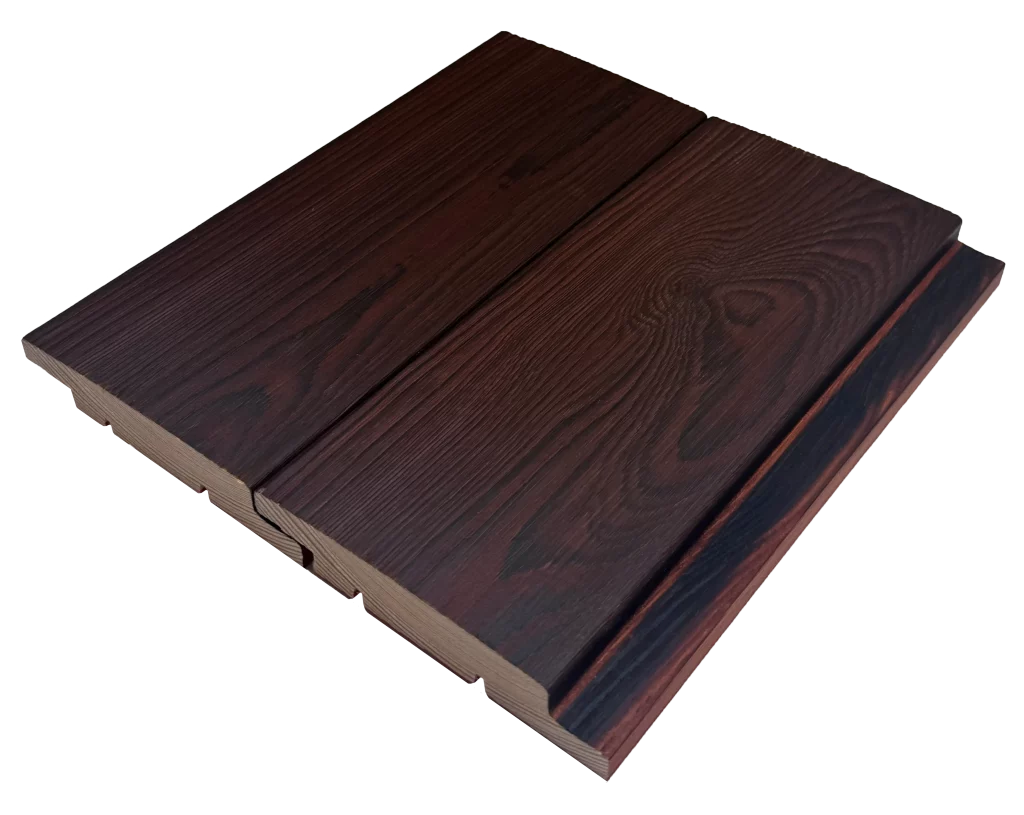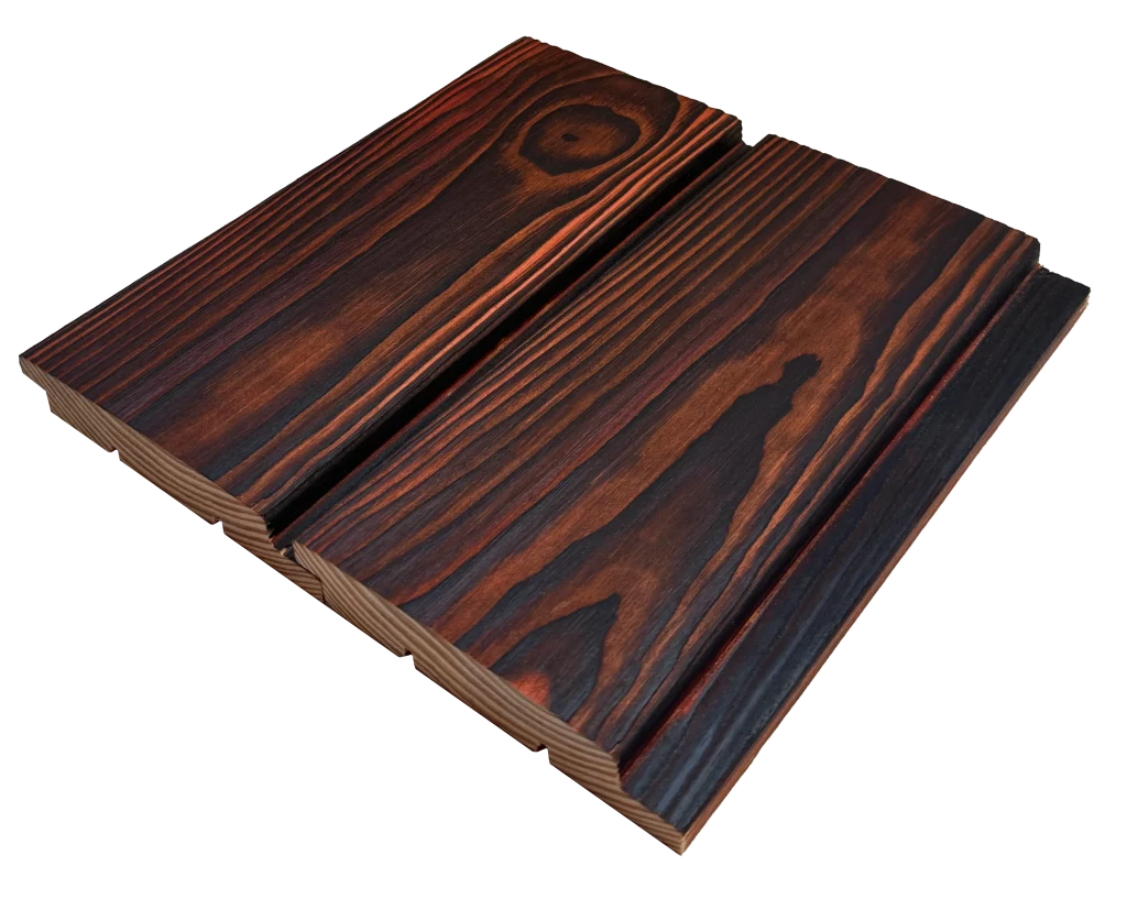 Rūpnieciski dedzināti priedes un egles koksnes dēļi ar kontrolētu liesmas iedarbību, nodrošinot iegrimi koksnē līdz pat ~3 mm. Pēcapstrādē, veicot birstēšanu, tiek noņemtas liekās pārogļojušās daļiņas, saglabājot izteiksmīgu koksnes šķiedru zīmējumu un vienmērīgu dedzinājuma tonalitāti.